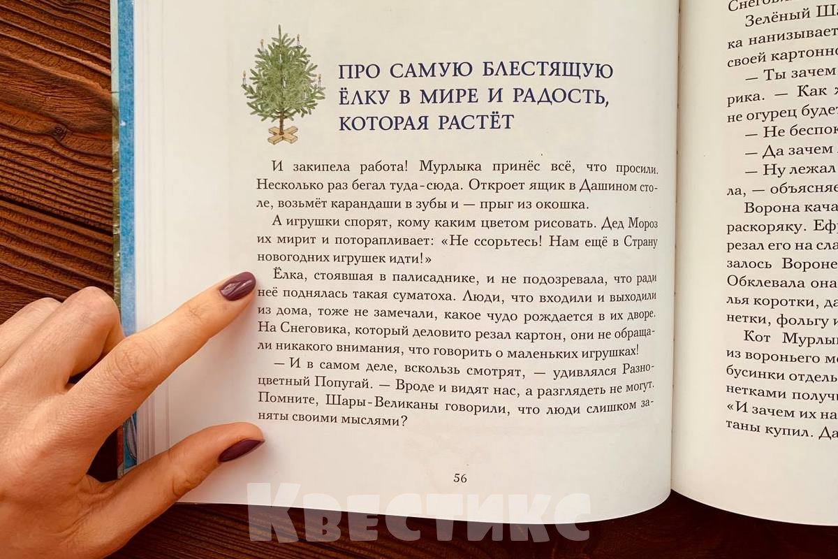 В ней ребята найдут подсказку: «Ищите в Стране новогодних игрушек! Страница 56, строка 21, первое слово» (ёлка).
