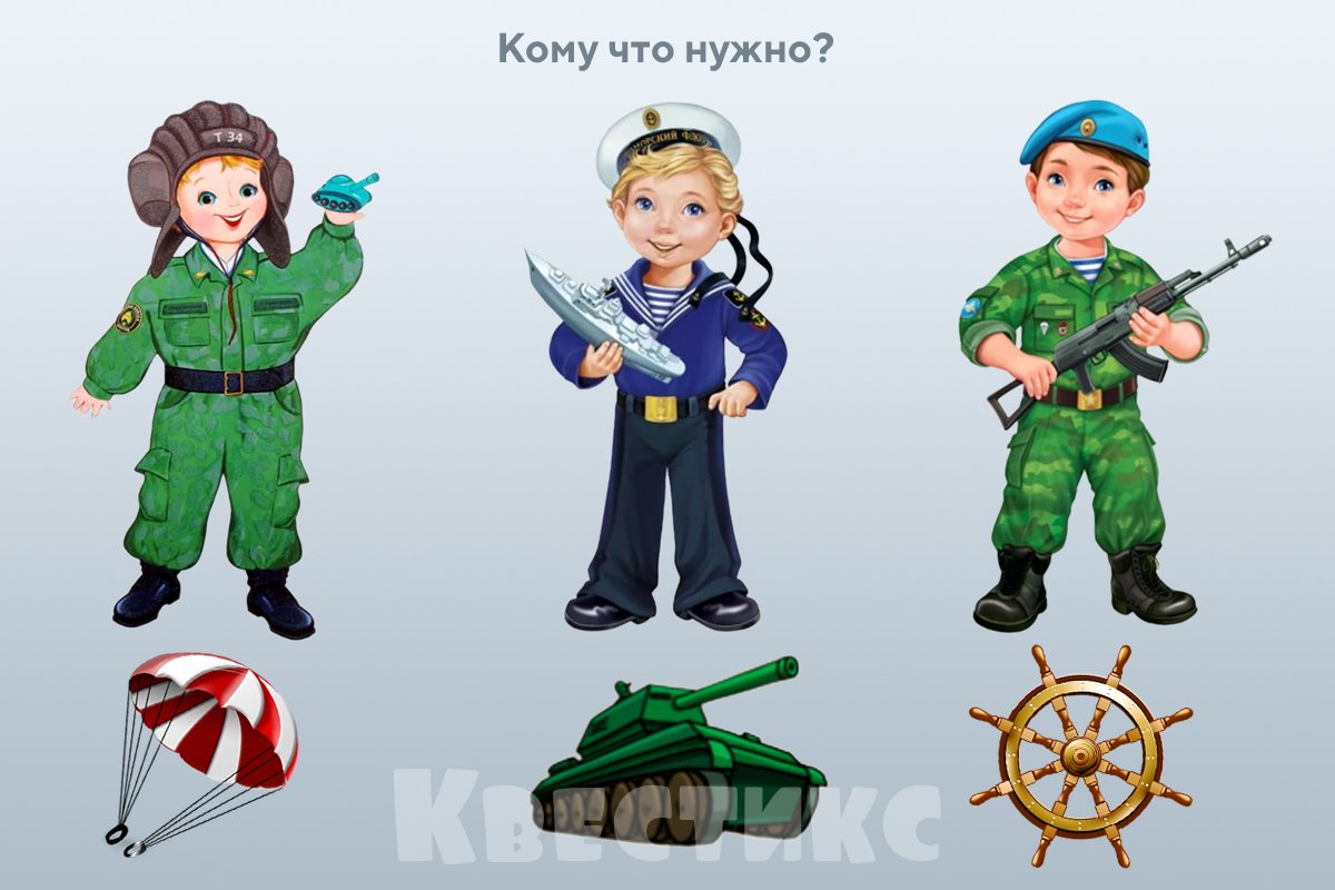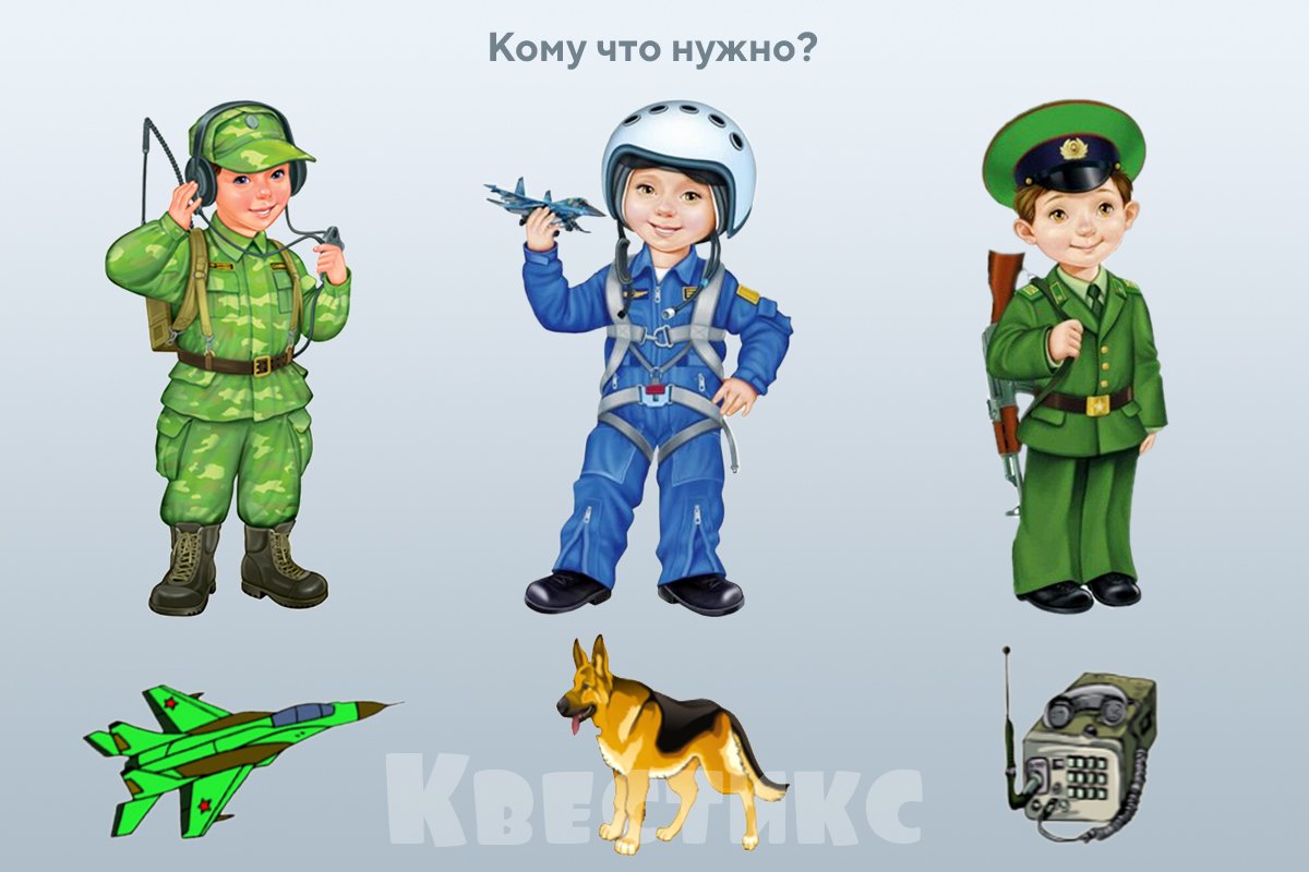 Найдите в Интернете картинки разных военнослужащих и предметы, которые нужны им на работе. Можно распечатать и вырезать их, чтобы дети соединили, кому что нужно, и тоже постарались назвать профессию человека и то, чем он пользуется.