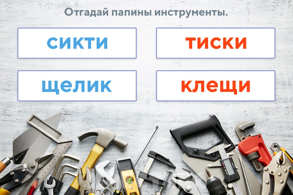 Ваша задача — взять несколько слов на тему инструментов и зашифровать их, перемешав буквы. Подойдут молоток, рубанок, клещи, отвертка, долото, дрель, тиски, топор.